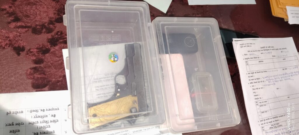 शाहाबाद बुलेटिन (बक्सर): बिहार के बक्सर जिले के धनसोई थाना क्षेत्र के सिसौंधा गांव के समीप से पुलिस ने दो युवकों को अवैध हथियार के साथ गिरफ्तार किया है, जो कथित तौर पर हवाई फायरिंग कर इलाके में दहशत फैला रहे थे। पुलिस को गुप्त सूचना मिली थी कि एक स्विफ्ट कार में सवार कुछ युवक फायरिंग करते हुए गुजर रहे हैं। इस पर कार्रवाई करते हुए पुलिस ने घेराबंदी की, जिसके बाद दोनों आरोपी पुलिस को देखकर भागने लगे।